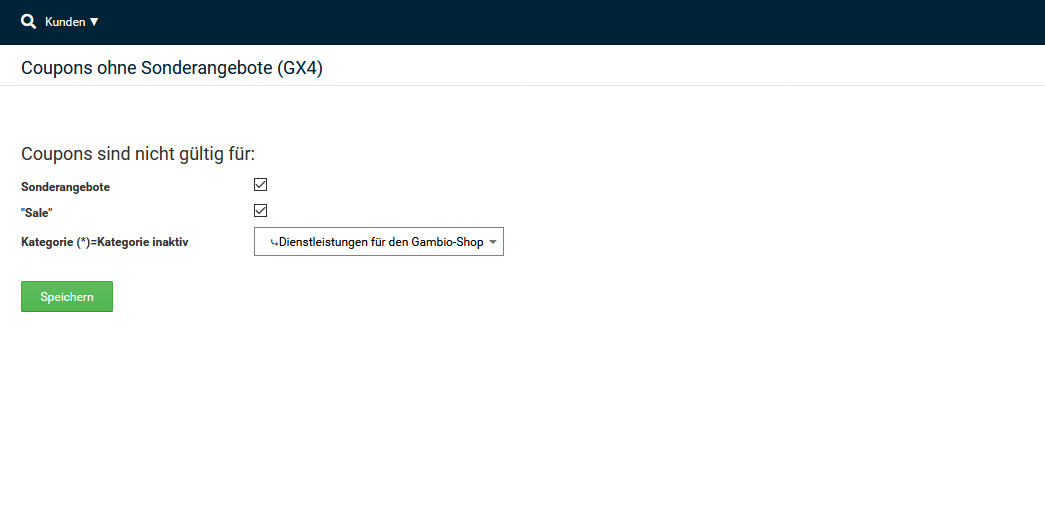 Als weiteres Highlight können Sie noch eine Kategorie wählen, die dann auch von den Rabatt-Coupons ausgeschlossen ist. Das ist nützlich, wenn Sie mit den Standard-Sonderangeboten arbeiten und evtl. eine Kategorie haben, in der die "Abverkaufsartikel" angeboten werden. Sie können aber auch Artikel mit einer Preisbindung in eine spezielle Kategorie verlinken, die muss nicht aktiv sein, dann werden diese Artikel auch nicht mit den Rabatt-Coupons rabattiert.